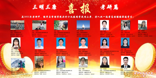 星光不负赶路人,天道酬勤佳音来。随着2021年全国硕士研究生复试工作接近尾声,经济与管理学院学子录取喜报频传。截至目前,共有19名学子获得境内外高校青睐,获得继续深造机会。2022年考研录取人数相比2021年增长280%,19名上岸学子覆盖全院各个专业,今天的成绩与收获,离不开考研学子的辛勤付出和智慧汗水,离不开全体教师的竭力培养和有力保障,同时也是经济与管理学院落实考研工作所交出的完美答卷。