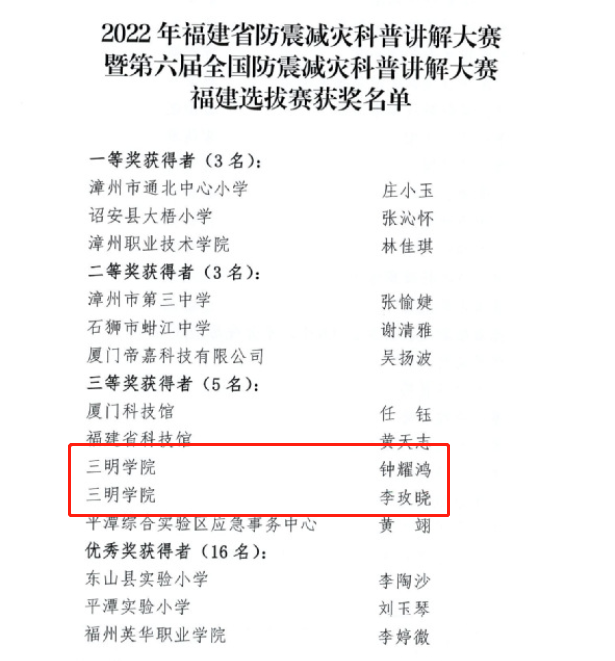 学习防震减灾知识,筑牢生命安全防线。落实防灾减灾救灾新理念新,普及科学知识,弘扬科学精神,4月7日由省地震局、省科协研究举办的全省防震减灾科普讲解大赛暨第六届全国防震减灾科普讲解大赛福建选拔赛正式落下帷幕。文化传播学院学子钟耀鸿、李玫晓荣获三等奖。