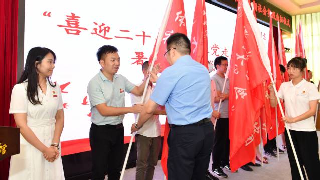廖景榕为11个二级学院实践团队代表及学校大学生骨干培训班实践团队授旗。