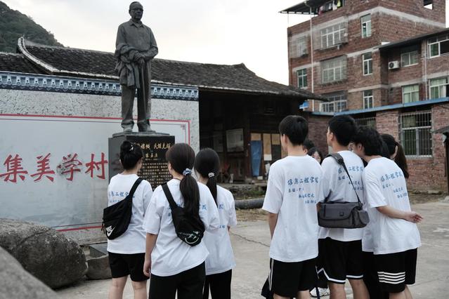沿着乡间小道一路向前,“力挽海权,培育专才”几个大字熠熠生辉,展示那一段热血抗战的红色历史。实践团队用相机定格下“大田集美航海学校”旧址的珍贵画面。