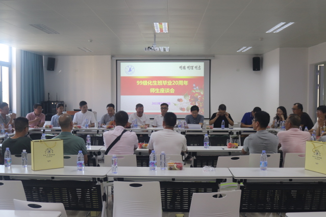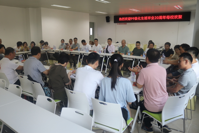 全体校友们来到工科楼A403会议室召开师生座谈会。赖文忠书记对99级化生班校友在毕业二十年之际重返母校表示热烈欢迎,为各位同学的成长进步和今天的成就感到骄傲,并向同学们介绍了学院近年来的发展情况,表达了对同学们工作和生活的良好祝愿。随后与会校友们依次介绍了自己的工作生活情况,共同回忆求学时期的点点滴滴,衷心感谢母校的培养和老师们的教诲,对学校和学院发展取得成绩感到由衷地高兴。校友们纷纷表示,将在各自的岗位上奋发有为,积极进取,以取得更好的成绩来报答社会,为学校增光添彩,同时希望浓浓的师生情、同窗谊像陈年老酒一样,弥久弥香。
