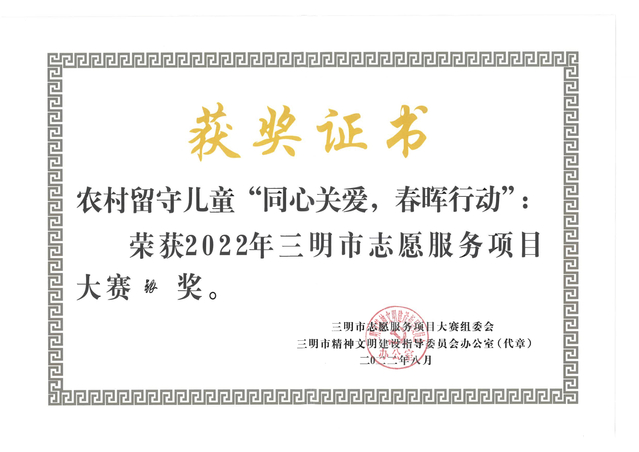 近日,由中共三明市委文明办、共青团三明市委等部门共同主办的2022年三明市志愿服务项目大赛暨展示交流活动圆满落幕,yl6809永利官网校推送的《农村留守儿童“同心关爱,春晖行动”志愿服务项目》经过项目初评、决赛路演答辩等层层选拔,喜获银奖。