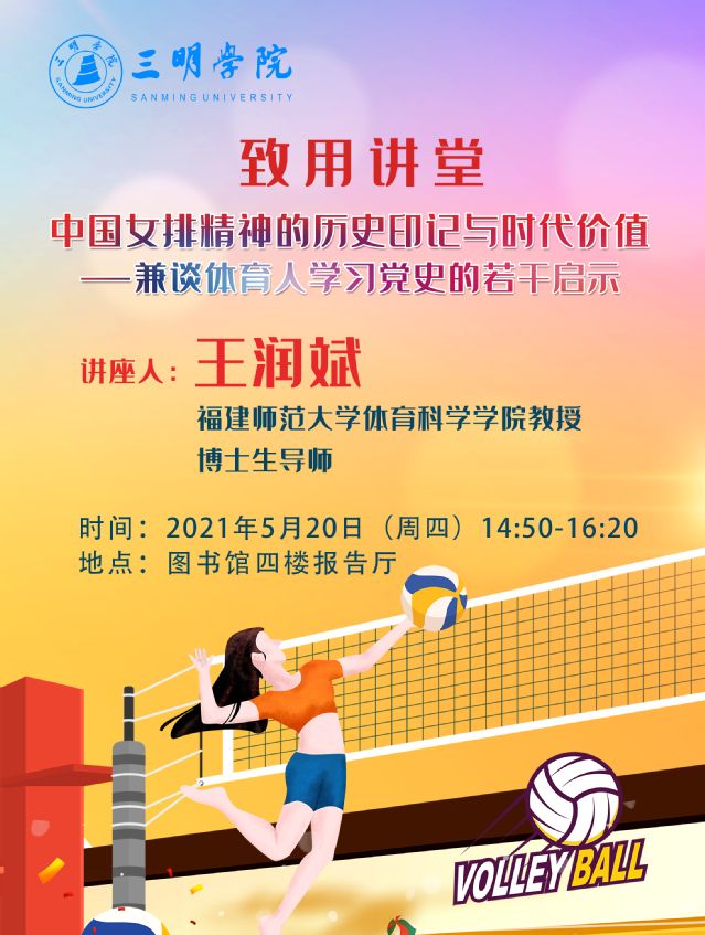 内容简介:报告将围绕什么是女排精神、为什么会有女排精神、女排精神的时代变迁、新时代学习女排精神的重要价值等内容展开,并将落脚点放在体育人学习党史的方法和路径上,提出体育人学党史要结合党和国家领导人有关体育的重要论述、党的体育政策方针、党的体育发展道路等角度,做到学史明理、学史增信、学史崇德、学史力行。