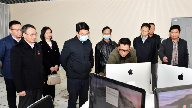 (图为市领导一行参观文化传播学院实验室)