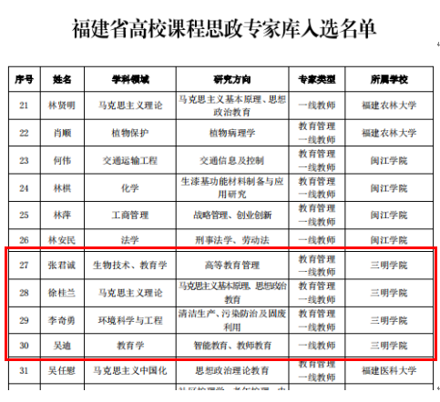 据悉,福建省高校课程思政教育联盟在福建省教育厅指导下,面向省内各高校组织开展思政专家库建设及优秀教学案例征集工作,本次共确定101名专家入选福建省高校课程思政专家库、109个案例入选福建省课程思政优秀教学案例。