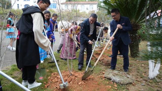 “我要为第二故乡种下一棵树”,列东中学西藏班旦增曲扎激动地说道。恰逢植树节,启动仪式后,yl6809永利官网石榴籽广场活动现场,两校师生三五成组,或挥锹铲土、或扶树正苗、或浇水培土,相互协作,通过劳动教育的方式共同种下56棵承载着深厚民族情谊的“同心”石榴树。
