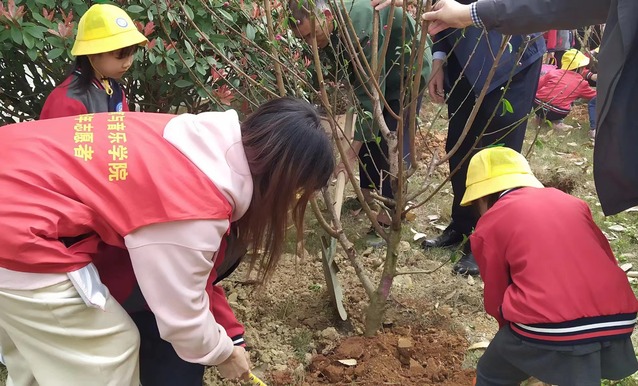 在植树活动现场,学生党员们身穿红色马甲,有的手拿铁锹,有的提浇水壶,带领着孩子们一起种下小树苗,充分展现出学生党员的青春风采和积极向上的风貌。孩子们在学生党员们的帮助下积极地扶苗填坑、提桶浇水,每个孩子的脸上都洋溢着快乐的笑容。一棵棵小树苗在孩子们心中种下一颗颗爱护环境、保护生态的种子。