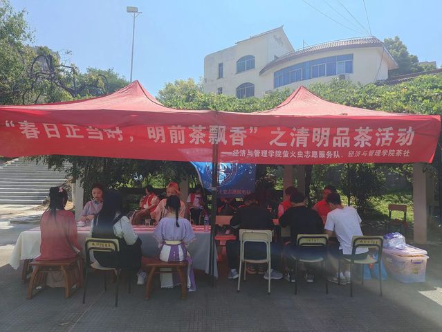 时至清明,茶花飘香。为加强我辈对中国文脉中国精神的认识,进一步传承发扬我国传统节日文化,积极响应“文化强国、文化兴国”的政策,经济与管理学院萤火虫志愿服务队于4月9日下午在南区石榴籽广场举办“春日正当时,明前茶飘香”之清明品茶活动。