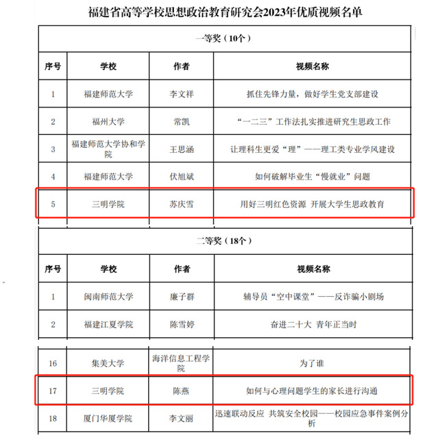 近日,福建省高等学校思想政治教育研究会公布高校辅导员队伍能力提升大数据赋能平台优质视频资源征集活动获奖名单,我校报送的作品荣获一等奖、二等奖各1项。
