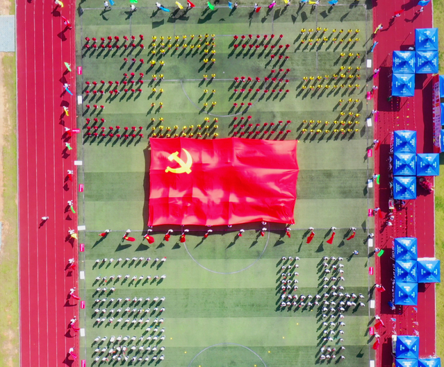百年栉风沐雨,当青年学子再次唱响李大钊先生的文章《青春》时,依旧激情澎湃。“以青春之我,创建青春之家庭,青春之国家……”伴随着恢宏大气的歌声,巨型党旗徐徐铺展开来,党旗团旗交相辉映,呈现出一片“中国红”的壮美画面。