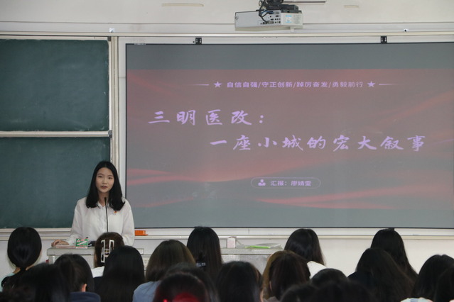 李建由《无奋斗不青春》这一主题展开阐述,引导和激励同学们励志做有理想、敢担当、能吃苦、肯奋斗的新时代好青年。吴欣宇同学以《画好山水画,绿色发展理念,在三明的生动实践》为主题,为同学们介绍了三明以绿色发展为基础,带动经济建设这一有益举措。廖婧雯同学围绕《三明医改:一坐小城的宏大故事》,以三明医改改什么、怎么改、再出发这三个方面展开,向同学们展现了三明医改的积极意义。大家宣讲的主题精彩,内容丰富,一个个生动的故事,一句句鲜活的语言,围绕主旋律传递出了正能量,用党的初心使命感召青年,引导广大同学坚定不移听党话跟党走,奋进新征程,建功新时代。