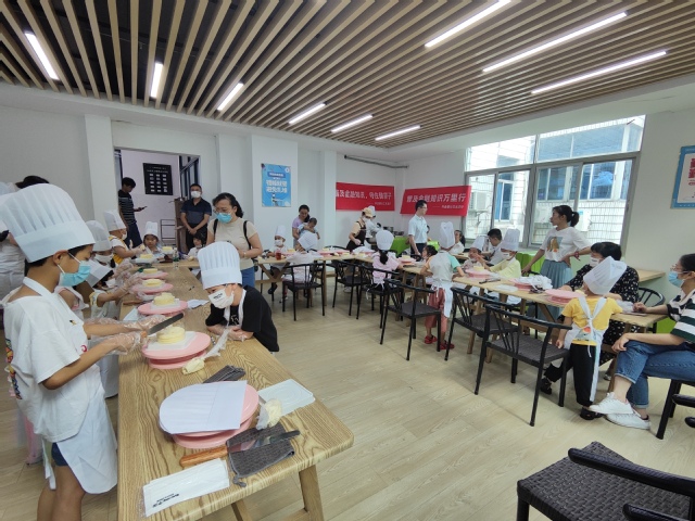 孩子们在糕点师的指导下兴致勃勃地大展身手,每个孩子都很认真地涂抹奶油、平铺水果,用装饰卡片装饰蛋糕,现场充满着欢声笑语,十分热闹。