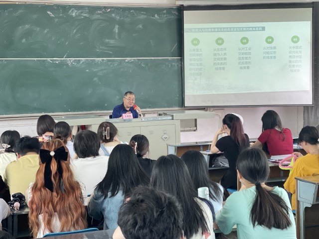 为深入开展学习贯彻习近平新时代中国特色社会主义思想主题教育,认真贯彻落实党的二十大精神和习近平生态文明思想。6月2日,马克思主义学院邀请教育部长江学者特聘教授、中南财经政法大学哲学院院长、博士生导师王雨辰教授于理工二A307开展题为“站在人与自然和谐共生高度谋划发展与美丽中国建设”专题讲座。马克思主义学院副院长徐桂兰主持,2022级思想政治教育专业全体学生到场聆听。
