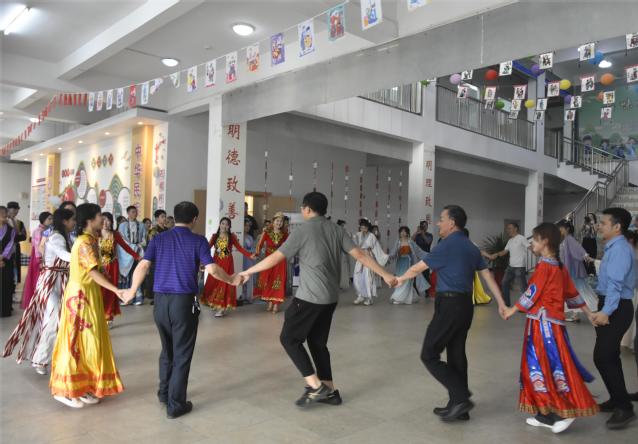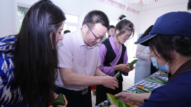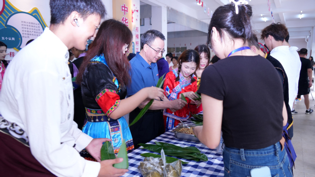 校领导赖锦隆、廖景榕莅临现场参观指导,并与师生们手挽着手、肩并着肩围成同心圆,一起跳民族团结舞;与来自“石榴籽工作室”的维吾尔族、藏族、布依族、苗族等10个民族20多名学生一起包粽子。现场其乐融融,拉近了师生的距离,促进了各族学子间的沟通了解,营造了民族团结一家亲的浓厚氛围。
