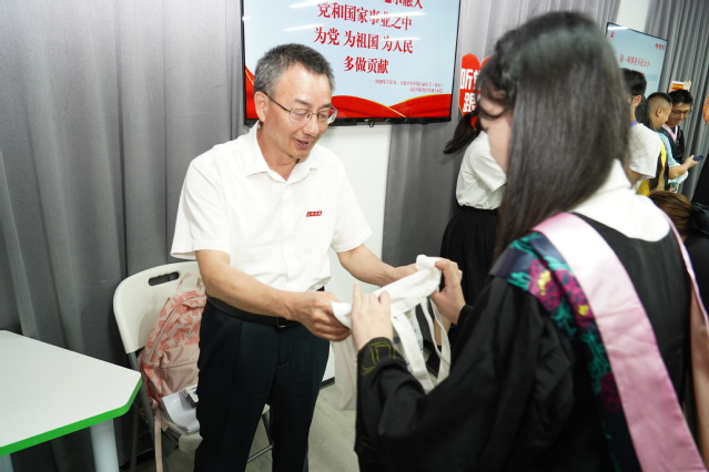 赖锦隆书记表达了对毕业生的难舍之情,感谢大家对学校的理解和支持,感谢辅导员们的精心培养。他用三个词寄语毕业生,一是执着,希望同学们坚守初心、执着追梦,具备坚毅的定力和从容的心境;二是情怀,希望同学们胸怀国家、心系人民,融入社会、感恩社会、感恩母校,孝敬父母、尊敬师长、帮助他人;三是担当,希望同学们以“功成不必在我,功成必定有我”的奋斗姿态,担负起民族复兴、国家振兴的历史重任,坚持终生学习,练就过硬本领,做到知行合一。