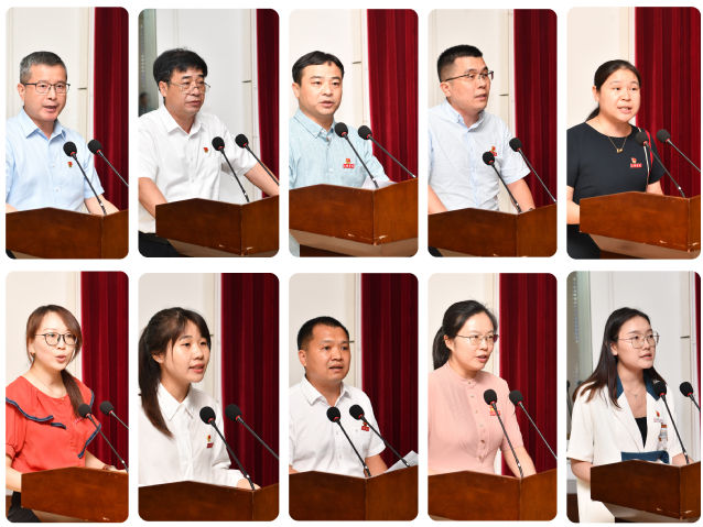 看着老党员胸前的纪念章熠熠生辉,跟着《初心之问》中每一名党员必须答好的“三问”,伴着耳边久久环绕的宣誓声,在座的师生党员干部心潮澎湃,感慨万千。校领导、二级学院党委书记、党支部书记、党员代表纷纷结合主题教育学习收获,畅谈所思所感所悟。