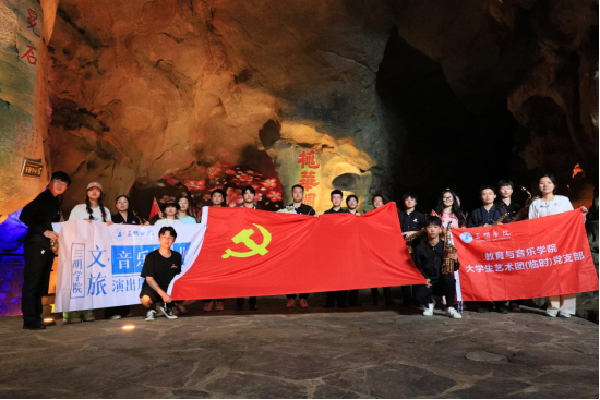滴水岩红色旅游景区是4A级旅游景区,景区内不仅岩石晶莹、色彩斑斓,在1931年--1934年期间,红军也在此设立战地医院。音乐学专业学生党支部编排数十首红色经典曲目,先后在东方军驻归化作战纪念雕像与玉虚洞红军战地医院旧址举办红色音乐演出。现场红色经典频现,引得游人纷纷驻足,众人高声合唱《游击队之歌》、《红色娘子军》等脍炙人口的革命音乐作品,景区俨然转变为主题教育党课现场,让每一位参与者都忆苦思甜,致敬烽火岁月。党支部通过探索音乐+文旅,将高雅艺术融入红色景区,营造了良好的文旅氛围,增添了景区的特色。