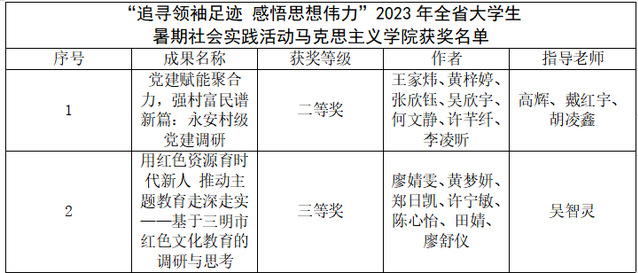 日前,中共福建省委宣传部、中共福建省委教育工委等单位联合发布《关于“追寻领袖足迹 感悟思想伟力”2023年全省大学生暑期社会实践活动评选结果的公示》,马克思主义学院喜获优秀成果奖2项,其中二等奖1项、三等奖1项。