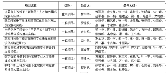 日前,福建省教育厅发布《福建省教育厅关于公布2023年本科高校教育教学研究项目立项名单的通知》(闽教高〔2023〕20号),我校获批重大项目1项、一般项目6项。
