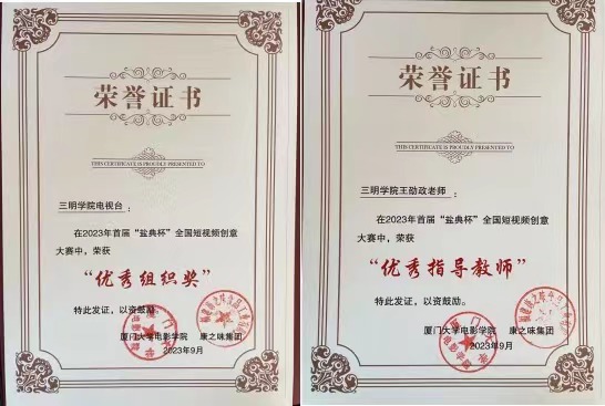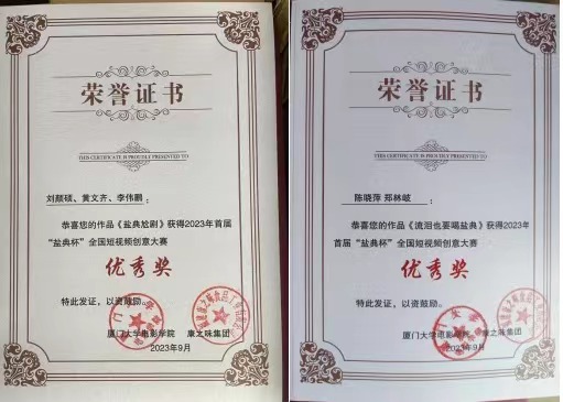 近日,2023年首届“盐典杯”全国短视频创意大赛结果揭晓,由我院报送的作品《盐典尬剧》(作者:刘颜硕、黄文齐、李伟鹏)和《流泪也要喝盐典》(作者:陈晓萍、郑林岐)获得优秀奖;作品《盐典多巴胺》(作者:张佳、郑碧芬、苏澜、杜墁芬、王成瑜)获得入围奖;王劭政老师获得大赛“优秀指导教师”称号;yl6809永利官网电视台获得大赛“优秀组织奖”。