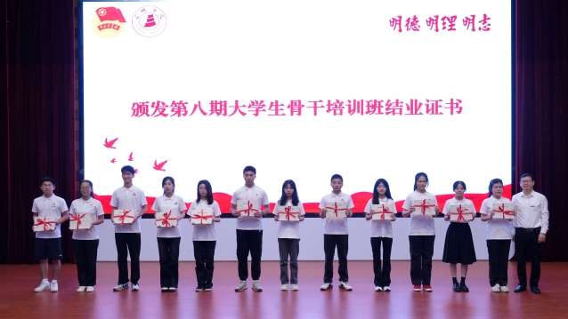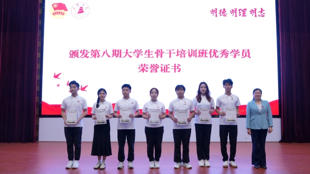 活动现场同时见证了第八期大骨班学员们的毕业和收获。校团委负责人宣读了结业及优秀学员表彰名单,准予111名学员结业,并授予14名学员“优秀学员”荣誉称号。党委宣传部、学生处负责人分别向学员代表颁发“优秀学员”荣誉证书及结业证书。