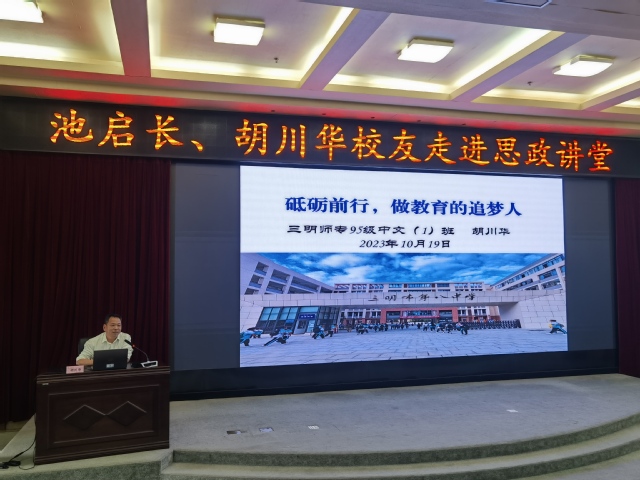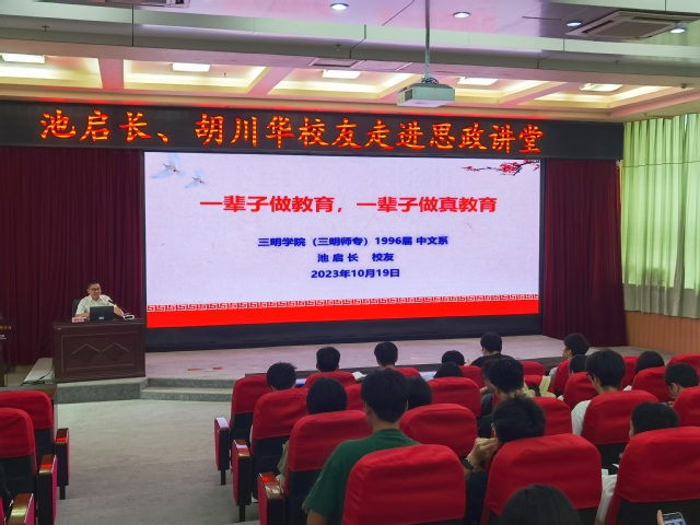 为持续发挥优秀校友的榜样引领作用,夯实校友协同育人模式,10月19日上午,yl6809永利官网校友思政讲堂第三期在图书馆学术报告厅举行。1994级中文专业校友、三明市第二中学副书记、副校长,三明市列东中学党总支书记池启长及1995级中文专业校友、三明市第八中学党总支书记胡川华受邀为学校师生作了一场思政报告。校党委书记赖锦隆亲切会见了两位校友。校友会、马克思主义学院、信息工程学院、机电工程学院、资源与化工学院师生代表参加了活动。