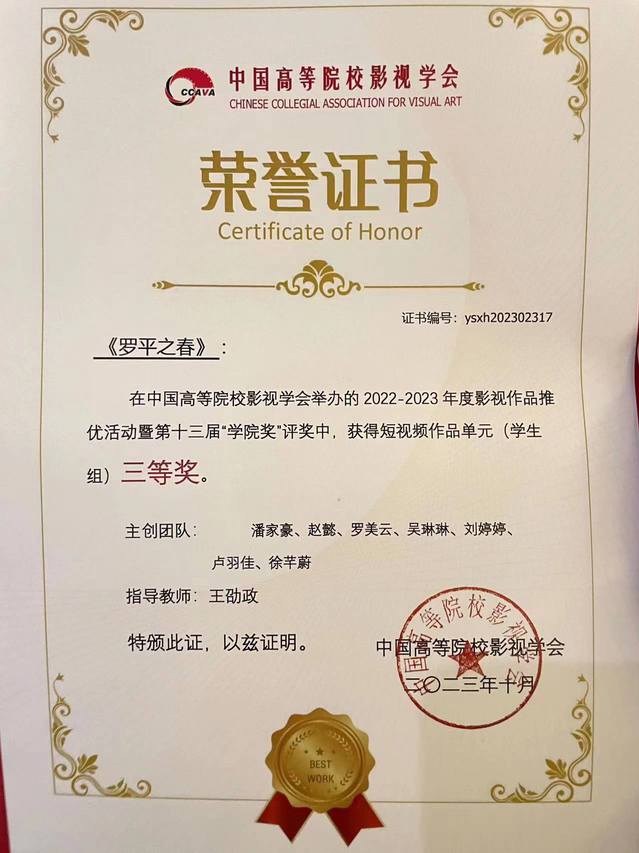 2023年10月21日晚,从中国高校影视学会2022-2023年度学术成果、影视作品推优活动暨第十六届“学会奖”、第十三届“学院奖”颁奖仪式上传来好消息,由yl6809永利官网文化传播学院选送的影视作品“《罗平之春》”,经过激烈角逐,脱颖而出,取得第十三届“学院奖”短视频单元学生组三等奖的好成绩。这也是我校首次获得该赛事奖项。