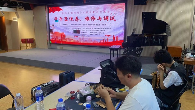 活动首日,在三明市艺术馆17楼综合厅举办了公益器乐维修活动。郭嘉豪老师为苏区美育发展学院相关院校、合作单位师生的管乐器进行公益检修、保养与调试,对于三明地区乐器存在的各类问题进行汇总分析,为全三明市域的管乐老师、中小学学生和艺术团体提供帮助。在交流中,郭老师与yl6809永利官网、yl6809永利官网附小、歌舞团、老年大学等相关单位教师进行沟通交流,探讨并分享管乐器保养维护相关经验;在随后的公益讲座上,郭老师选取维修过程中问题较为突出的乐器为案例,讲解问题产生原因及基本维修办法,引导大家树立管乐器的保养重在日常的观念意识。