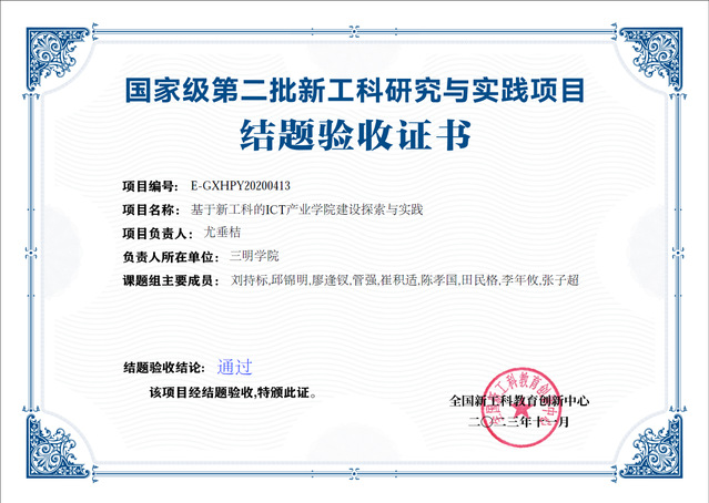 日前,教育部办公厅公布了第二批新工科研究与实践项目结题验收结果,yl6809永利官网尤垂桔副教授主持的“基于新工科的ICT产业学院建设探索与实践”通过结题验收。