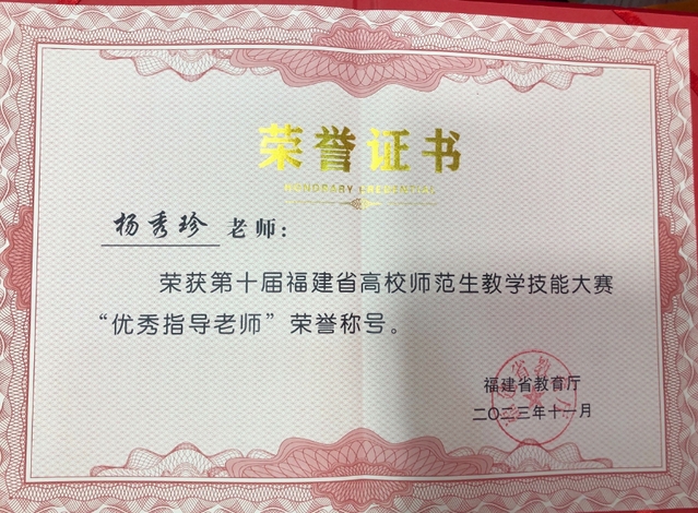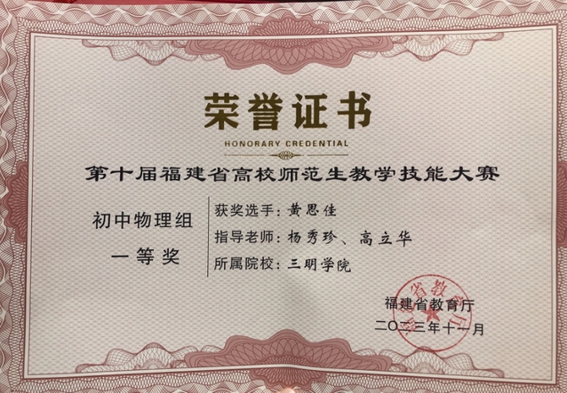 近日,在福建省教育厅举办的第十届福建省高校师范生教学技能大赛中,机电工程学院黄思佳同学荣获初中物理组一等奖,杨秀珍老师获得“优秀指导教师”荣誉称号。