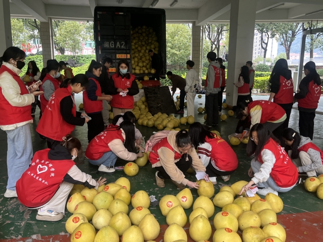 甜柚由校友与经管学院“萤火虫”志愿服务队一起进行分装分发。运输车门打开,柚香四溢,一个个饱满的甜柚从车上溢出,聚成一堆堆小柚山。志愿者们认真擦拭甜柚上的雨水和尘土,一一摆放整齐。甜柚经过采摘、运输、分袋、包装最后交托在母校手中,既是校友对母校的热切关心,也是和在校师生的情感传递!
