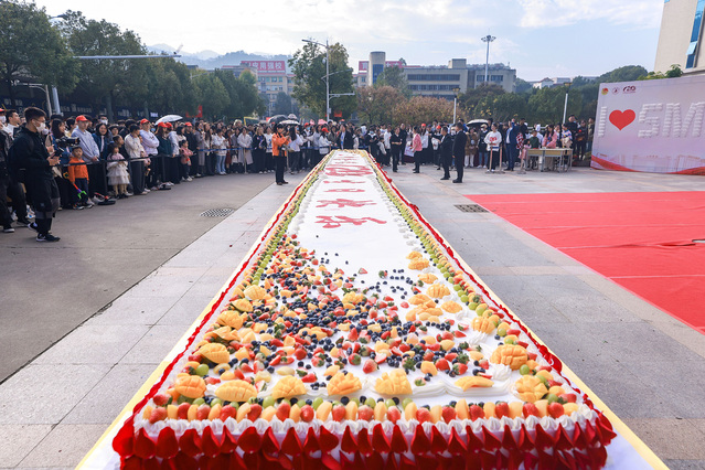 舞龙舞狮、乐队演奏烘托出喜庆、热烈的庆生氛围。上午八时许,图书馆前已是人头攒动,师生校友们陆续等候在侧,现场见证巨型校庆蛋糕的出炉。120周年校庆蛋糕平面设计规格为12米*1米,由10余位师傅耗时近3小时现场制作完成。蛋糕上“yl6809永利官网”“生日快乐”的字样在绵延起伏的奶油海浪与五彩缤纷的水果沙滩上熠熠生辉,校庆logo图案则象征着yl6809永利官网历经的120年光辉岁月。