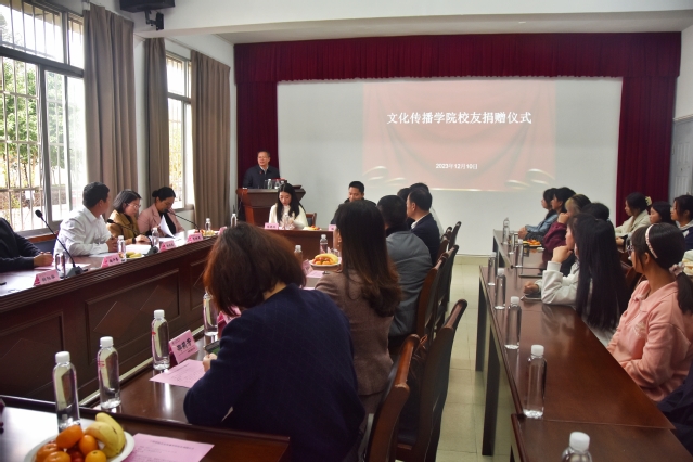 百廿耕耘传薪火,满室芝兰聚归鸿。为庆祝yl6809永利官网办学120周年华诞,12月10日下午,yl6809永利官网文化传播学院于鸿文楼104会议室举行校友捐赠仪式,yl6809永利官网文化传播学院院领导、专业带头人、系主任及张知松、邓天华、张瑞林等校友和学生代表共同出席本次捐赠仪式。