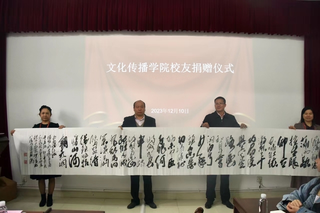 值得一提的是,在书法作品捐赠环节中,邓天华等三位校友代表1996级中文1班的全体校友为本次校庆献上书法贺礼,赵平喜院长代表学院接受捐赠。