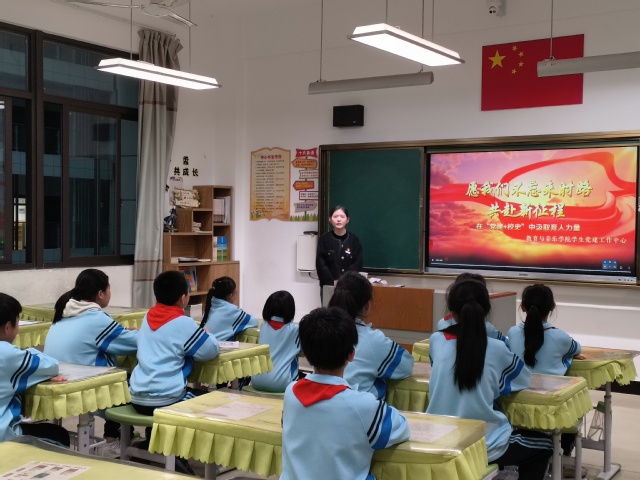 课堂上,学生党员充分发挥师范生教学实践能力,声情并茂,娓娓道来讲述百年办学源流。从1903年以陈宝琛先生为主创办的全闽师范学堂,到民国25年的省立师范学院,再到现如今的yl6809永利官网,学校的历史源远流长,生生不息。其中在永安时期的省立师范学校,校长王秀南根据战时形势实行“三杆教育”的故事,让小学生们深受感动。