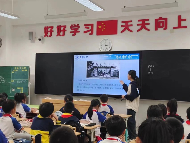 校史传承红色基因,培养学生拼搏进取精神。教育与音乐学院学生党员深入三明市各小学,以校史微课为立足点,整合学习的校史故事,把历史转化为课程,把史料转化为教材,将校史资源融入“四点半课堂”展开教学。