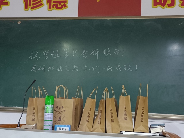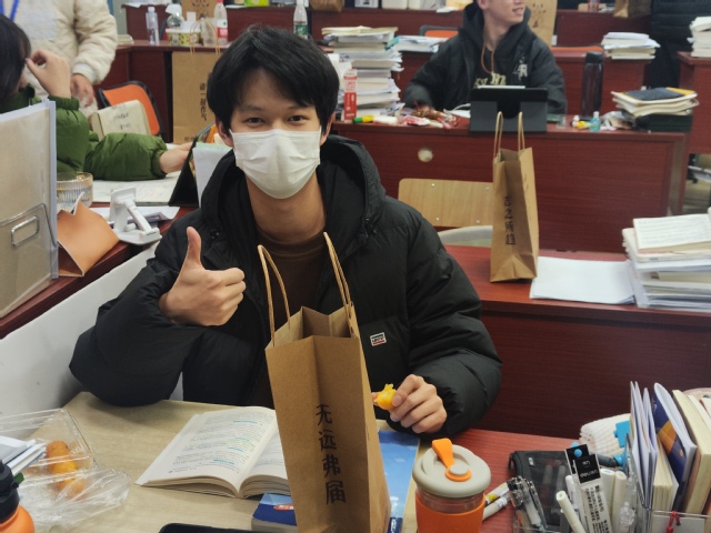 这是一份带着全校师生祝福的礼物。活动前期,学生会积极动员师生为备战考研的明院学子送上祝福。“愿所有考研人都能如愿以偿,一战成“硕””“考研顺利,未来璀璨辉煌!”……线上QQ空间、微信等新媒体平台陆续收到90余条祝福留言。线下,百余人次师生在图书馆门前的活动幕布上书写祝福,提交190余份素材。工作人员精选30条优质祝福语,誊抄在了明信片上,与寓意“马到成功”的橙子、“榜上有名”的棒棒糖、“一旺到底”的旺仔牛奶以及孔庙祈福签字笔、明日明月定制钥匙扣等礼物一起,打包进了这份诚意满满的礼物中。