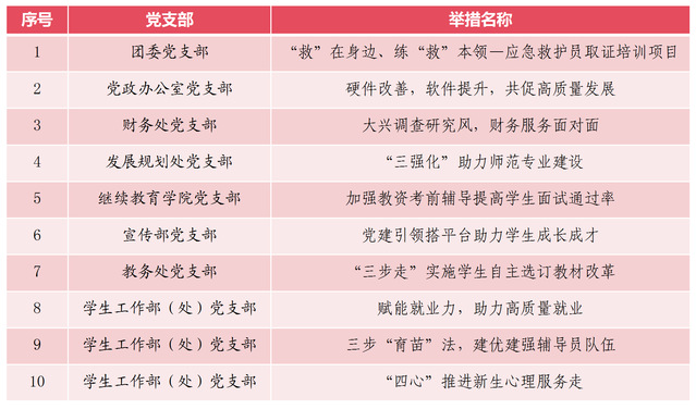 此次评选共有23个党支部积极申报,累计报送服务师生举措30项,通过综合现场展示和网络评选两个环节结果,研究确定《“救”在身边、练“救”本领—应急救护员取证培训项目》等10项举措为本届服务师生“最佳举措”。