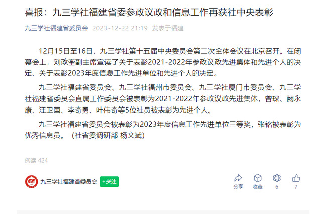 12月15日至16日,九三学社第十五届中央委员会第二次全体会议在北京召开。在闭幕会上,刘政奎副主席宣读了关于表彰2021-2022年参政议政先进集体和先进个人的决定、关于表彰2023年度信息工作先进单位和先进个人的决定。资化学院李奇勇教授被表彰为2021-2022年参政议政先进个人,全省仅5位社员获此项荣誉。