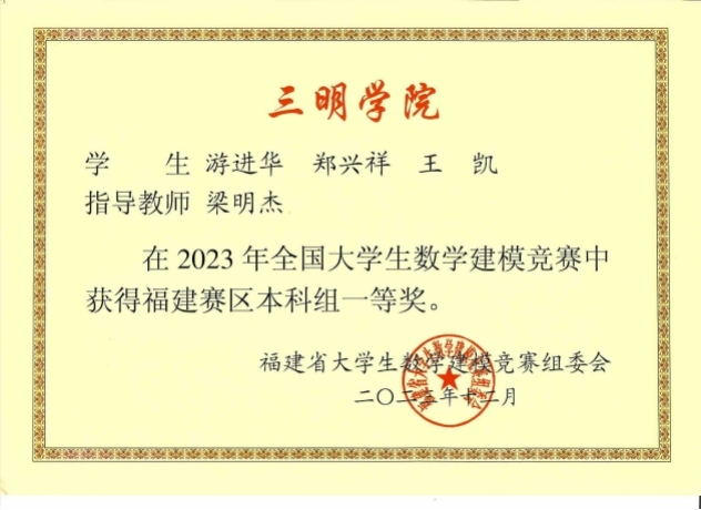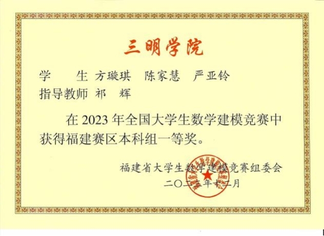 2023年,信息工程学院学子在高教社杯全国大学生数学建模竞赛中,共斩获1项本科组全国二等奖,4项福建赛区一等奖、5项福建赛区二等奖,10项福建赛区三等奖,获奖在福建省本科院校中名列前茅。