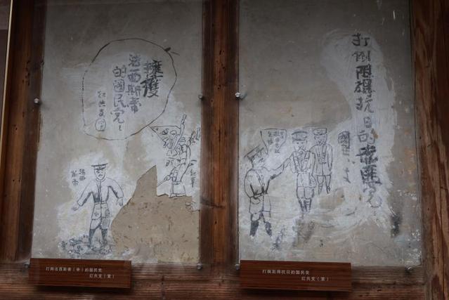 参观至其中的一间房间,实践团成员们发现这间屋子内的标语字迹清晰、语句完整,吴主任缓缓地向大家诉说标语背后的故事。老百姓一开始不了解共产党,国民党对共产党的恶意抹黑也在一定程度上加深了百姓对我们党的恐惧心理。在红军刚来此驻扎之时,由于村民们听说了共产党是赤匪的传言,早早地就躲到山上去了。过了几天,心惊胆战的村民下山悄悄来到红军驻扎之地探查,发现逢源堂和作求堂的墙上甚至走廊都布满了黑色大字,红军细心地向不解其意的村民解释标语的涵义,村民们这才明白原来共产党是真真正正为民的好政党,彻底放下心来和红军站在一条战线上。红军主力长征之后,白色恐怖笼罩着永安,国民党军卷土重来,很快就占领了各村镇。他们对红军标语恨之入骨,见到书写红军标语漫画的房屋就烧掉,得知谁家儿郎参加红军就杀掉。为了保护红军留下的标语漫画,洪田镇马洪村廖家人找来厚草纸,将自家墙上的标语漫画蒙住,或搅拌白石灰,将墙上的标语漫画糊上掩盖起来,廖家人称之为“为红军标语穿上白褂子、纸衣裳”。“大家看这幅红军漫画:国民党士兵穿着笔挺的军装,残忍地踩在工农劳苦大众的尸骨上,而红军战士虽穿着草鞋、打着绷带,却是真正地一心一意为老百姓谋福利。”吴主任指着一幅珍贵的红军漫画向队员们讲述着。据了解,永安红色标语诞生于中央苏区初创时期,红军乡村宣传工作非常活跃,标语保存至今说明永安广大群众当年支持红军,对共产党饱含感情。