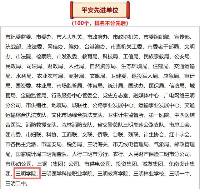 近日,三明市委、市政府表彰了2023年度平安建设(综治工作)先进单位和平安先进县(区),我校荣获“2023年度三明市平安先进单位”荣誉称号,这是我校连续第四年获此殊荣。