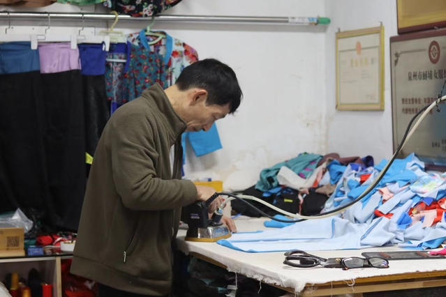 随后,队员们前往蟳埔女服饰传习所,拜访了丰泽蟳埔女服饰代表性传承人黄晨老师。步入传习所,映入眼帘的是各种传统的蟳埔女服饰,还有正在认真制作服饰的黄老师。队员们有幸参观了簪花制作的全过程,并对黄晨老师进行了简短的采访,重点了解了簪花的历史以及演变历程。蟳埔女依海而生,服饰多为“大裾衫、阔脚裤”,便于海滩上劳作,头戴簪花代表了蟳埔女对待生活的乐观心态。传统的蟳埔女服饰有清朝的、民国时期的、还有解放后的,衣服虽越变越短了,但它依然保留了最基本的款式,叫“七分袖,八分裤”。