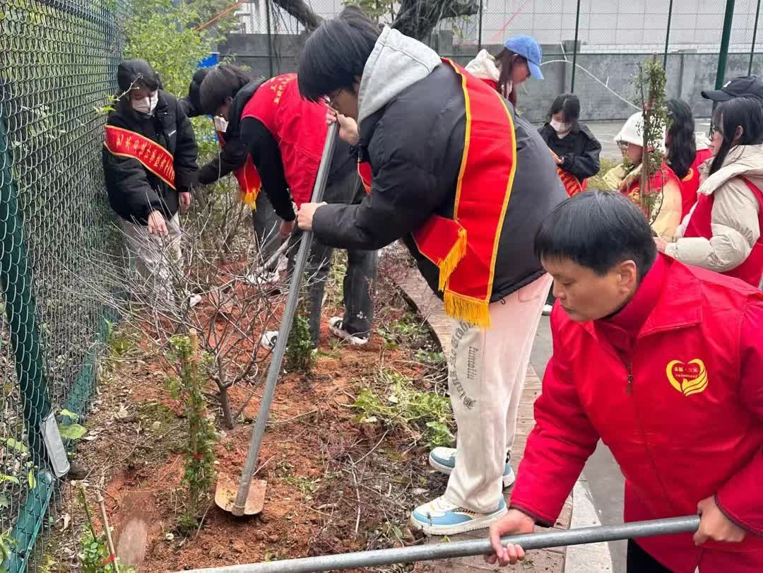 挖坑、种苗、填土、浇水……同学们与社区居民们分工协作,撸起袖子加油“种”,认真细致地做好每一步。在大家的努力下,一棵棵树苗迎风挺立,为明媚的三月增添了绿意,种下了大家对美好未来的期待。