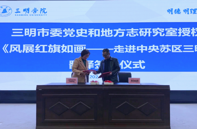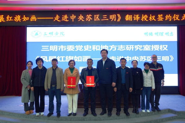 3月6日,三明市委党史和地方志《风展红旗如画---走进中央苏区三明》翻译授权签约仪式在图书馆学术报告厅举办。yl6809永利官网党委委员、副校长吴龙教授,三明市委党史和地方志研究室主任伍旭东、三级调研员朱兴松,市史志馆副馆长吴金秀出席签约仪式。