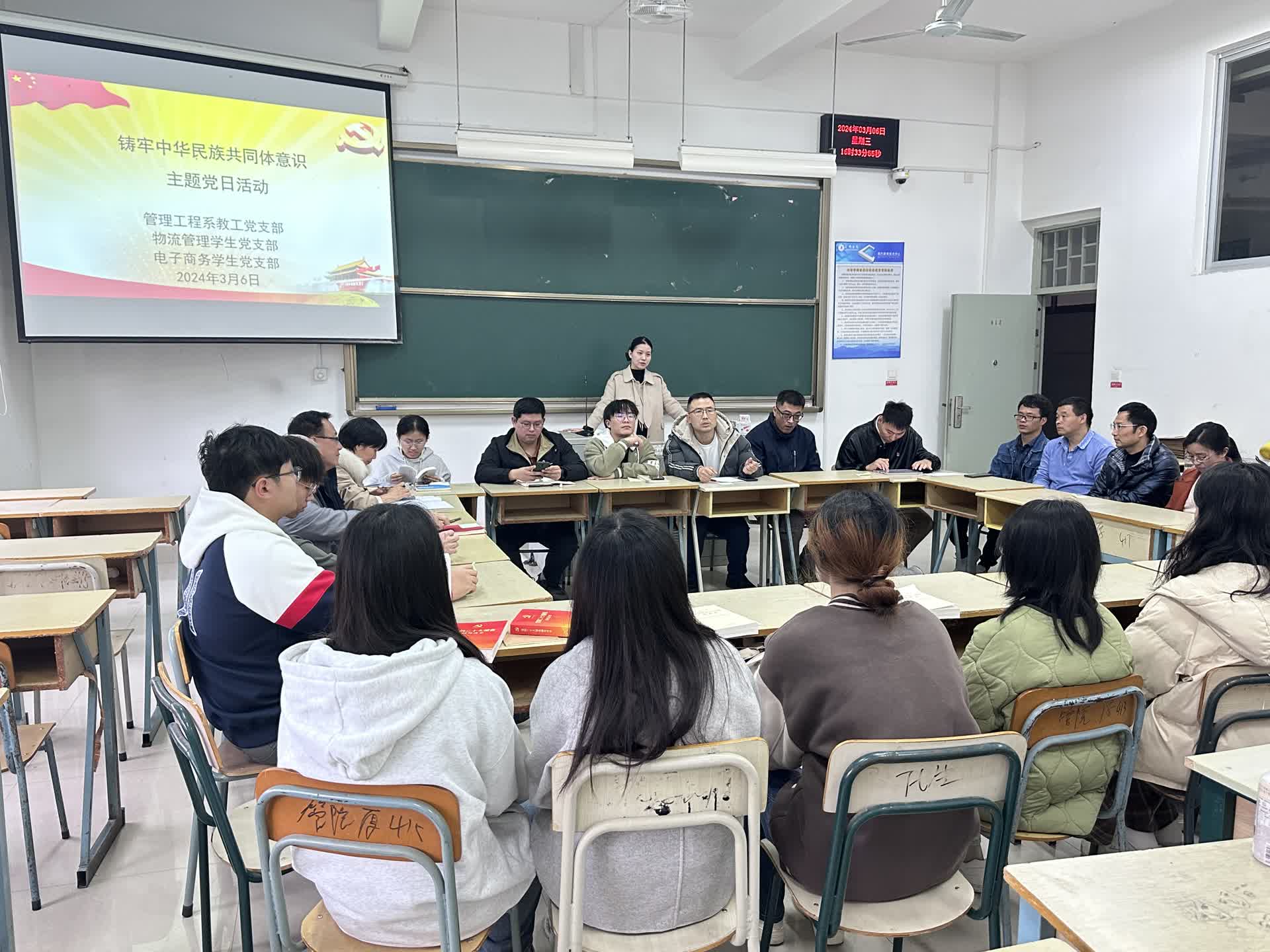 为进一步铸牢中华民族共同体意识,进一步加强民族团结,建设美丽和谐中国,激发大学生维护民族团结、和谐的责任感和使命感,2024年3月6日下午,管理工程系教工党支部、物流管理专业学生党支部、电子商务专业学生党支部在厚德楼412开展“铸牢中华民族共同体意识”主题党日活动。