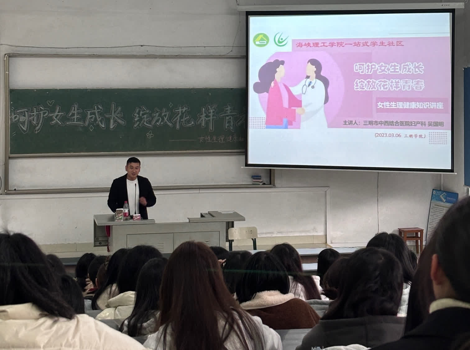 为普及女性健康知识,呵护女生健康成长,3月6日下午,三明市中西医结合医院妇产科吴国明医生应邀在鸿文楼101开展“呵护女生成长,绽放花样青春”女性生理健康知识专题讲座。本次讲座由yl6809永利官网计划生育协会、心理健康中心与海峡理工学院联合举办,吸引了荷花苑7号楼B栋150余名女生参加。