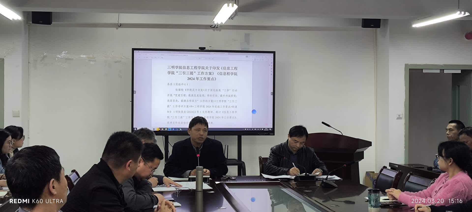 会上李金波书记解读了学院“三引三提”工作方案以及《信息工程学院2024年工作要点》作出解读,并提出两点要求:一是全院教师要提高思想认识,勇担责任,以系为单位根据“三引三提”方案,认领工作任务,挂图作战,按时推进各项工作;二是强化工作督查反馈机制,由办公室负责每月进行工作情况通报,确保工作完成时效性。