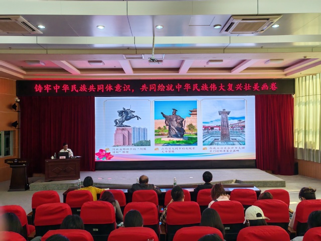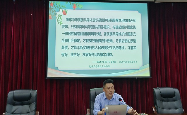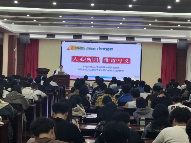 张君诚以“铸牢中华民族共同体意识,共同绘就中华民族伟大复兴壮美画卷”为题,从中华民族多元一体的基本国情开篇,详细阐述铸牢中华民族共同体的基本理念、战略意义、实践路径及明院做法等四个方面内容,深入剖析中华民族共同体意识背后所蕴含的深厚历史积淀和重要的现实意义,引导同学们牢固树立“休戚与共、荣辱与共、生死与共、命运与共”的共同体理念,努力讲好民族团结进步故事,自觉做民族团结进步的忠实维护者。