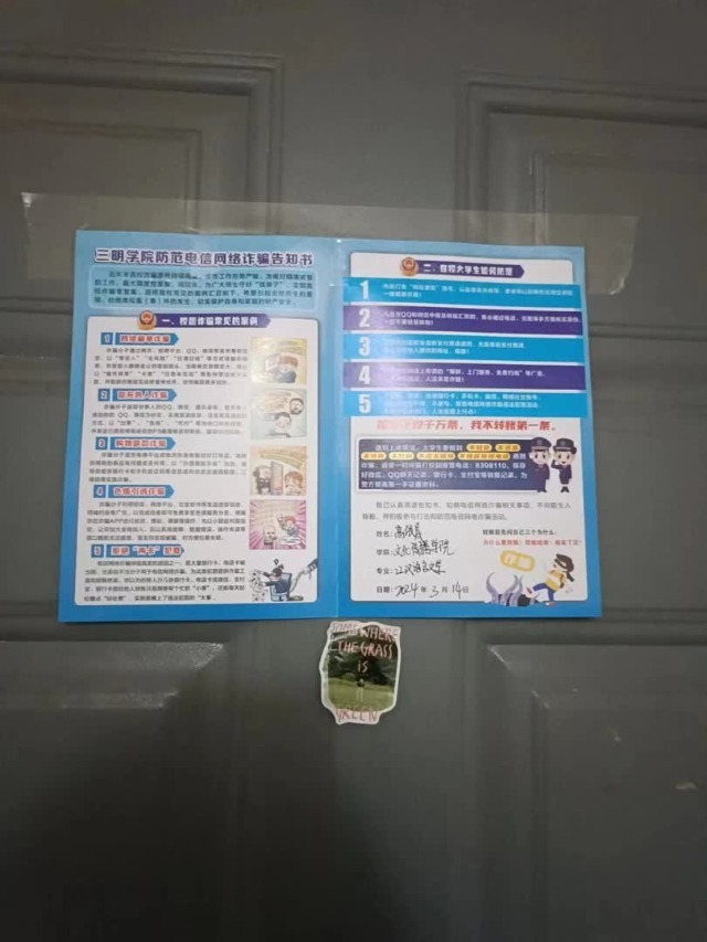 学院全面统筹开展线上、线下双渠道防诈教育,发放《yl6809永利官网防范电信网络诈骗告知书》777份,要求学生阅读签字并张贴于宿舍醒目位置,确保防电信网络诈骗教育全员覆盖。此外,在学院公众号推送多条反电信诈骗相关推文,从电信诈骗典型案例分享、电信诈骗手法解析、电信诈骗处理方式等多角度普及相关知识,提高学生甄别和防范电信网络诈骗的能力。